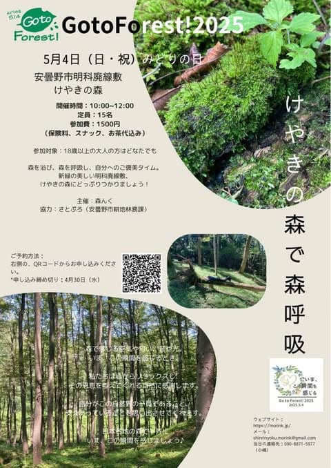 長野県は全国で森林セラピー基地が一番多い県だが、中信地区には森林セラピー基地がなく、原 薫さん(柳沢林業)の声掛けで森林セラピストの荻場、森林浴ファシリテーター1期生の小嶋3人でそれぞれの地元である松本市、塩尻市、安曇野市で、多くの方に身近な里山の良さ、森林浴の効果、森林へ関心をもってもらう為に2021年5月4日みどりの日をスタートに森林浴のイベントを企画することとした